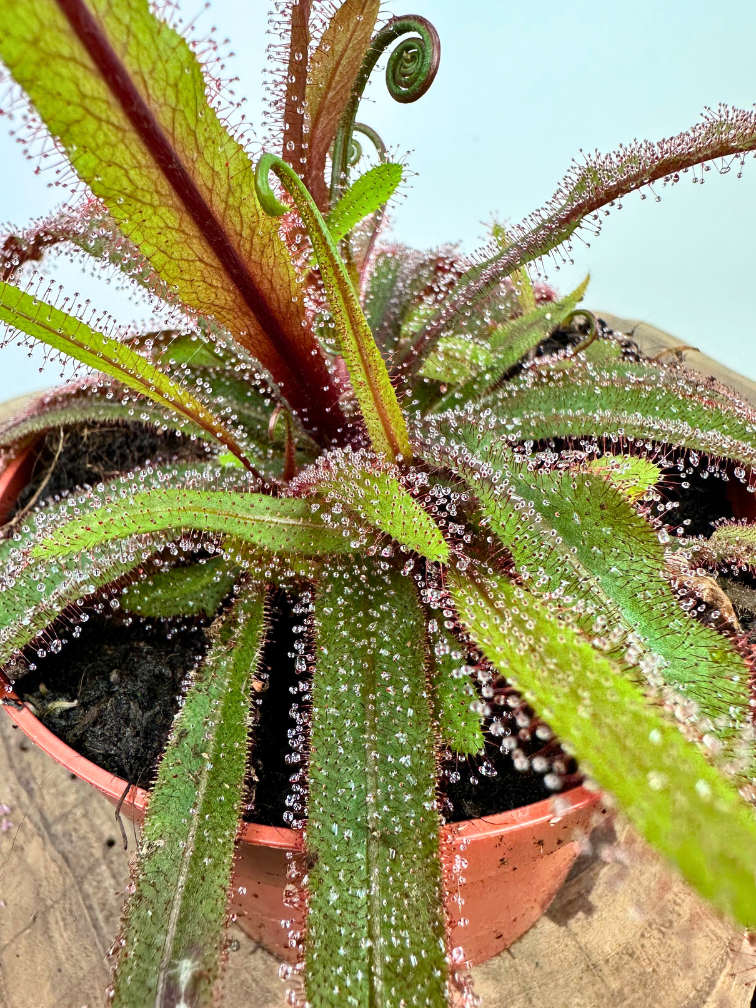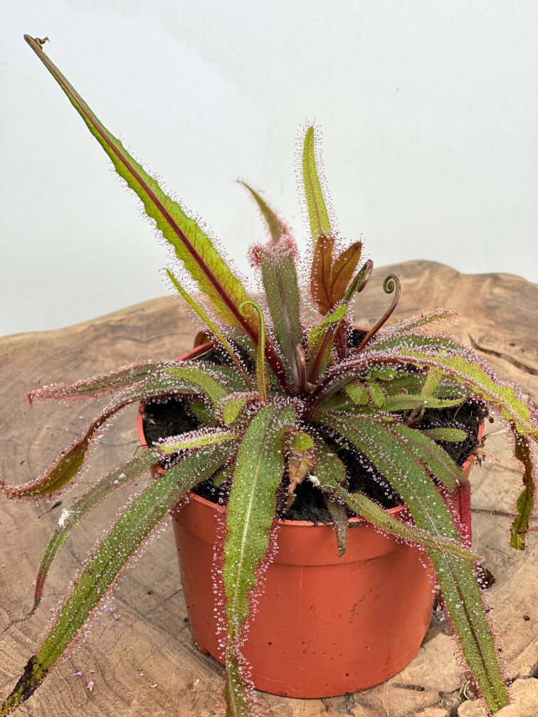 Vi har denna vackra art (Drosera Adelae) i vårt sortiment. Vi har ett mycket begränsat utbud. Denna art har svärdformade klibbiga blad och förekommer i en liten del av Australien (Storlek: ø 12 cm x ↕ 15 cm.